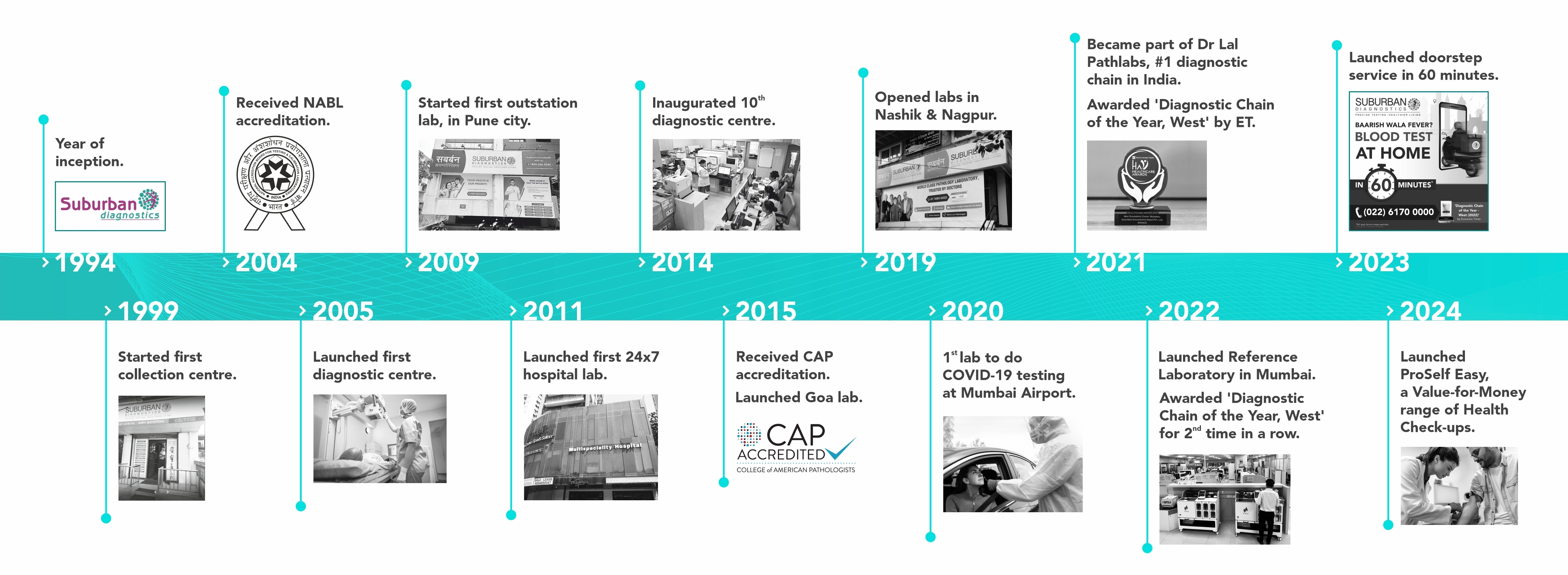 One of the biggest names for diagnostics in India, Suburban Diagnostics first took off in 1994 as a small pathology lab at Lokhandwala, Andheri West, Mumbai, with the intent of delivering trailblazing, high-quality diagnostic services as a friendly neighborhood pathology lab. Over the 3 decades, we have built a network of 250+ centers in more than sixteen cities of India.